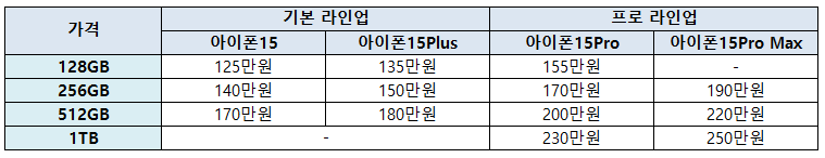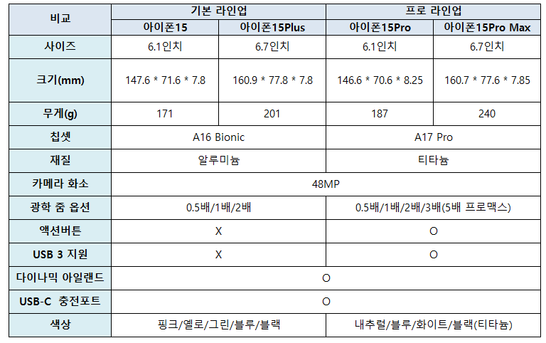이번에 출시된 아이폰15의 크기는 전작과 사이즈가 똑같습니다. 총 기본 라인업 2가지 아이폰 15와 아이폰 15 플러스, 그리고 프로 라인업으로 아이폰 15프로, 아이폰 15프로 맥스 이렇게 총 4가지로 출시되었습니다.
