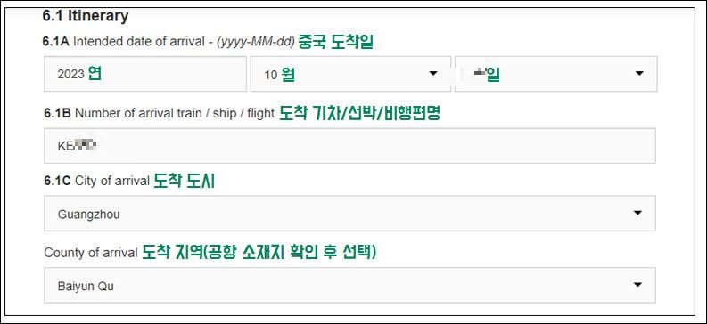 중국 도착 날짜, 비행기 편명, 도착 도시(Beijing, Shanghai, Guangzhou 등), 그리고 공항 소재지 확인 후 도착 지역까지 작성하시면 됩니다.