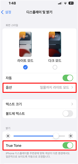[설정] → [디스플레이 및 밝기] →[라이트 모드 켜기]→[옵션/ 일몰부터 일출까지]