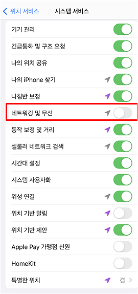 [설정] → [개인 정보 보호 및 보안] → [위치 서비스] → [시스템 서비스] → [네트워킹 및 무선 끄기]