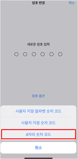 [설정] → [Face ID 및 암호] → 암호 입력[암호 변경] → 새로운 암호 입력 창이 뜨면 [암호 옵션 클릭] → 4자리 숫자코드