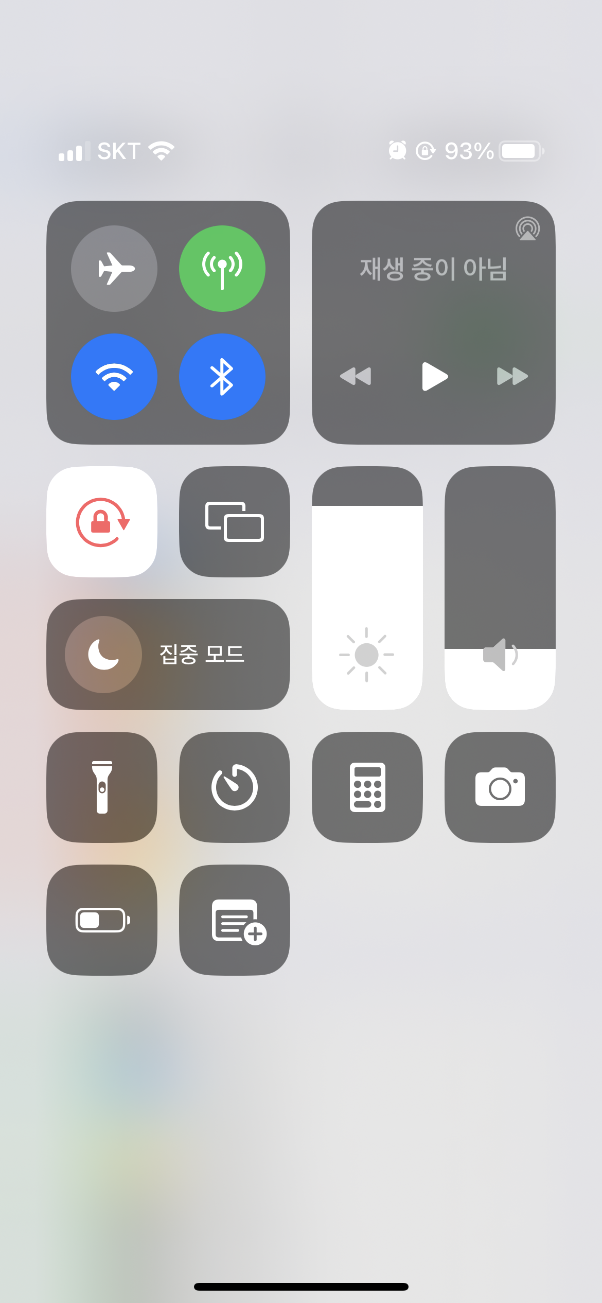 제어센터는 폰 우측 상단(배터리 부분)을 아래로 터치해서 내리면 아래와 같은 제어화면이 나오는데요. 해당 제어센터에서 본인이 자주 이용하는 기능을 편집 추가하여 필요할 때 빠르게 실행할 수 있도록 설정이 가능합니다.