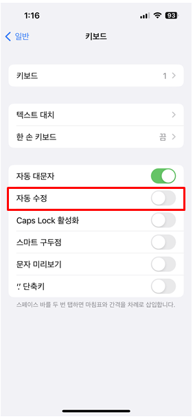 [설정/일반] → [키보드] → [자동수정 끔]