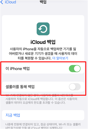 [설정] → 설정 맨 상단 애플 아이디 선택 [Icloud 선택] → [Icloud 백업 켜기]→ [셀룰러를 통해 백업 끄기]